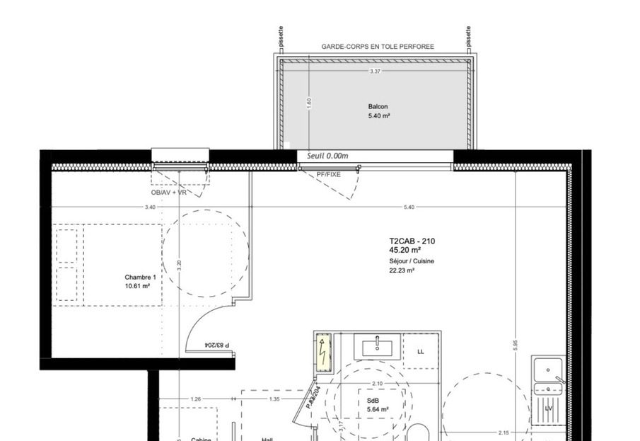 Ce logement de type 2 de 45,20 m² se compose d’un hall d’entrée, d’un salon-séjour lumineux s’ouvrant sur un balcon de 5,40 m² orienté EST, d’une cuisine ouverte, d’une salle de bains avec wc, une chambre principale et d’un espace cabine.